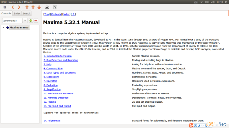 有了GUI的封裝,我們的學習曲線都要簡單很多,因為它的功能都在它的菜單欄中體現出來了。只不過,目前的wxMaxima似乎有一個致命的bug,在我的Ubuntu上,只要在對話框中輸入括號它就會崩潰。Maxima也自帶完善的文檔,如下圖: