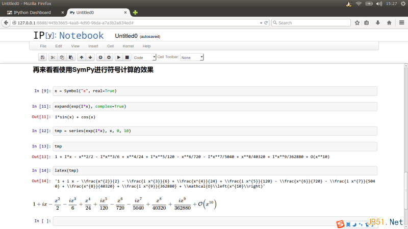 從上圖可以看到,SymPy的latex函數可以把輸出的數學公式轉換成LaTeX代碼,不過該代碼有點問題,它里面每個反斜杠都變成了雙反斜杠。將該LaTeX代碼復制、修改后,輸入Markdown區域就可以看到完美的數學公式了。