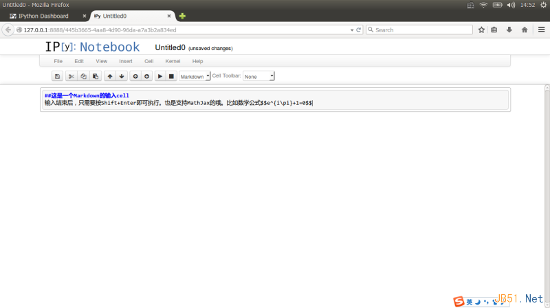 按Shift+Enter即可結束該區域的輸入,并執行和顯示效果。如果以后要重新編輯里面的內容,雙擊該區域即可。Markdown區域也是支持MathJax的哦,如下圖: