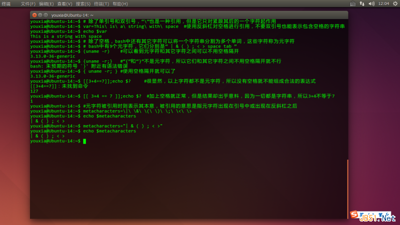 最常見的元字符就是空格。 從上面幾張圖片可以看出,如果要將一個含有空格的字符串賦值給一個變量,要么把這個字符串用雙引號包圍,要么使用“/”對空格進行引用。 從上圖中可以看出,Bash中只有9個元字符,它們分別是“| & ( ) ; < > space tab”,而在其它編程語言中經常出現的元字符“. { } [ ]”以及作為數學運算的加減乘除,在Bash中都不是元字符。
