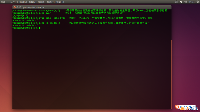 10.以上流程全部完成后,最后去掉字符串外面的引號(如果有的話)。以上流程只按以上順序進行一遍。比如不會在變量展開后再進行大括號展開,更不會在第10步去除引用后執行前面的任何一步。如果需要將流程再走一遍,請使用eval。