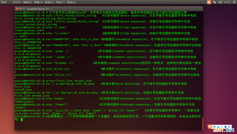 在上面的圖片中可以看到,有一些展開方式在被雙引號包圍的字符串中是不起作用的,比如大括號展開、波浪符展開、單詞分割、文件路徑展開,而只有參數展開、命令替換和算術展開是起作用的。從圖片中還可以看出,字符串中的參數展開、命令替換和算術展開都是由“$”符號引導,命令替換還可以由“`”引導。所以,可以進一步總結為,在雙引號包圍的字符串中,只有“$、`、/”這三個字符具有特殊含義。