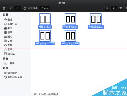 3、把下載下來的wingdings、wingdings 2、wingdings 3、Webdings、MT Extra這些字體,復(fù)制到主文件夾下的.fonts文件夾里,再去啟動(dòng)wps看看還有沒有“系統(tǒng)缺失字體……”提醒對(duì)話框,沒有就成功了!