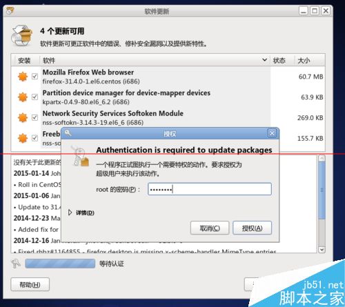 3、此時(shí),點(diǎn)擊“安裝更新”,會(huì)彈出提示框要求輸入root用戶密碼。在此,我們輸入密碼,點(diǎn)擊“授權(quán)”。