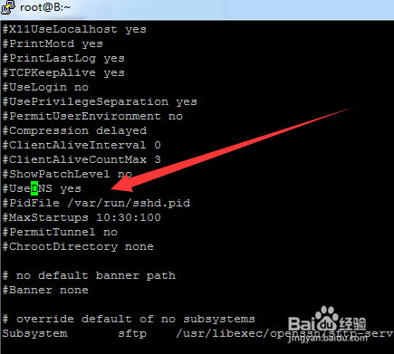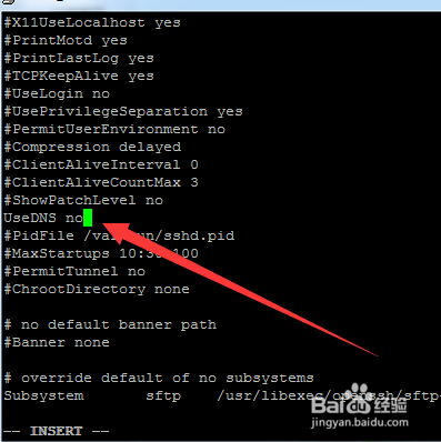 5、我們把前面的#號(hào)去了,然后把yes 改變?yōu)閚o,UseDNS no。