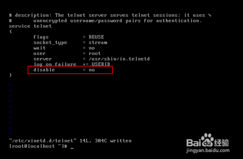 2、使用命令“vi /etc/xinetd.d/telnet”編輯Telnet的配置文件,將disable的值改成no。