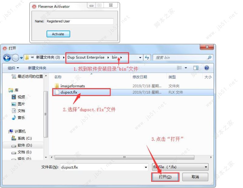 11.彈出彈窗,在彈窗中選擇軟件安裝目錄--->Dup Scout Enterprise--->bin--->dupsct.flx,選擇打開,如圖
