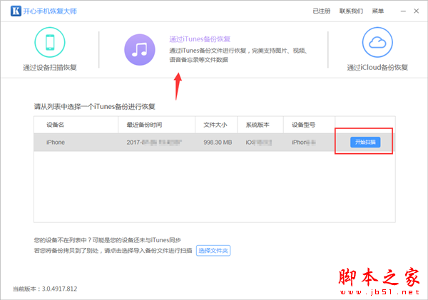 根據時間,設備信息選擇iTunes備份文件,點擊【開始掃描】按鈕,跳轉至iTunes備份恢復模式。(手動點擊【選擇文件夾】,識別拷貝至本機的iTunes備份文件)