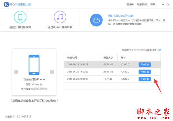 登錄您的iCloud帳號。根據備份設備名,備份時間,點擊【開始下載】按鈕即可將您iCloud帳號上的備份文件下載至本機。(第一次下載成功后即跳轉至iCloud備份恢復模式,否則您可以點擊【開始掃描】按鈕進行跳轉操作)