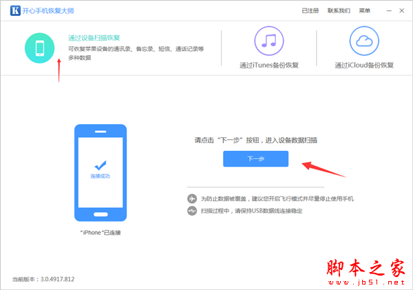 1.通過設備掃描恢復:打開開心手機恢復大師,并且連接您的手機(第一次連接需要在您的手機上點擊【信任】按鈕,允許軟件連接設備);