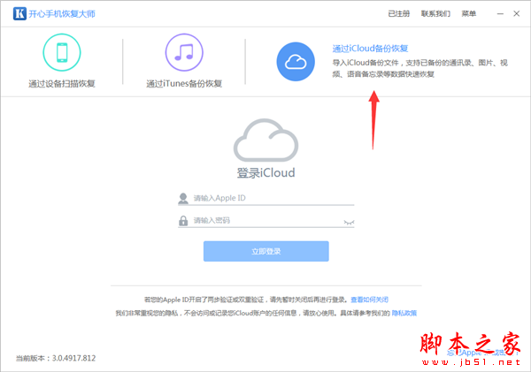 3.通過iCloud備份恢復:點擊頂端的【通過iCloud備份恢復】,在文本框中根據需求輸入Apple ID,密碼;