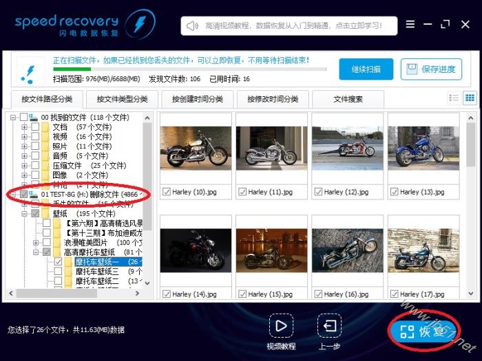 5、僅用幾秒鐘,軟件已經(jīng)找到很多刪除的文件。 左邊樹形控件,“01 TEST-8G(H:)刪除的文件(438個文件)”,表示在H盤找到了438個刪除的文件。 用鼠標左鍵點擊樹形控件或列表控件上的小方框,勾選需要恢復的文件,左下角顯示當前勾選的文件數(shù)量。然后點右下“恢復”按鈕。