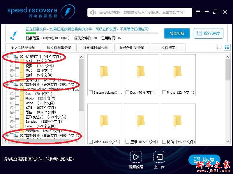 12、如果以上都沒找到您的文件,請耐心等待掃描。隨著掃描時(shí)間的增長,找到的文件越來越多。 我們軟件擁有領(lǐng)先的邊掃描邊顯示功能,一般都不需要等掃描結(jié)束,找到您的文件就可以立即恢復(fù)。 現(xiàn)在又找到03分支,里面共有6830個(gè)文件。 您隨時(shí)可以點(diǎn)擊右上角的“暫停掃描”按鈕,暫停掃描; 點(diǎn)擊“保存進(jìn)度”按鈕,保存當(dāng)前掃描到的數(shù)據(jù),方便下次繼續(xù)掃描。