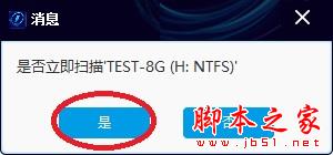4、彈出對話框,提示“是否掃描TEST-8G(H:NTFS)”,點(diǎn)“是”,軟件掃描H分區(qū)數(shù)據(jù)。