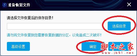 6、點(diǎn)擊“選擇目錄”按鈕,選擇恢復(fù)的文件保存在哪個(gè)目錄。然后點(diǎn)“確定”按鈕。 注意:請不要將文件恢復(fù)到有數(shù)據(jù)需要恢復(fù)的分區(qū)里,以免造成二次破壞。