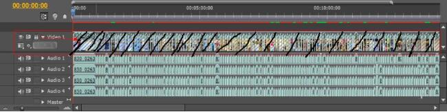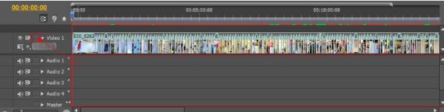 3、確認(rèn)視頻軌道上的素材被黑色細(xì)杠覆蓋,如圖,