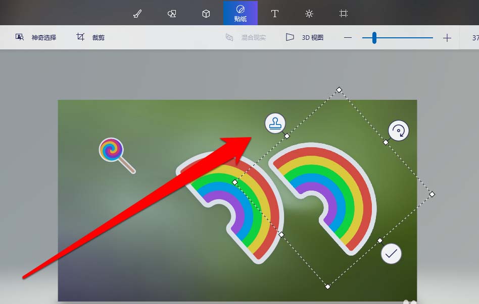 6、將貼貼紙放在圖片上,還可以進行操作。