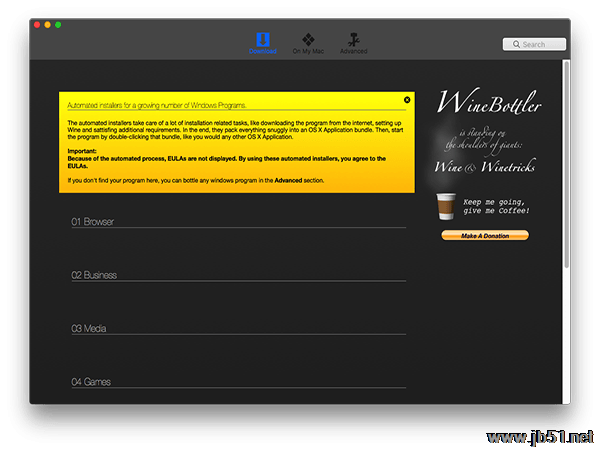 4、接下來我們需要在“Finder”——“應用程序”中打開“WineBottler”。可以看到“Download”,“On my Mac”,“Advanced”三個選項。“Download”可以不用管,“On my Mac”是可以管理移除你使用時的容器的。我們主要關注“Advanced”選項。