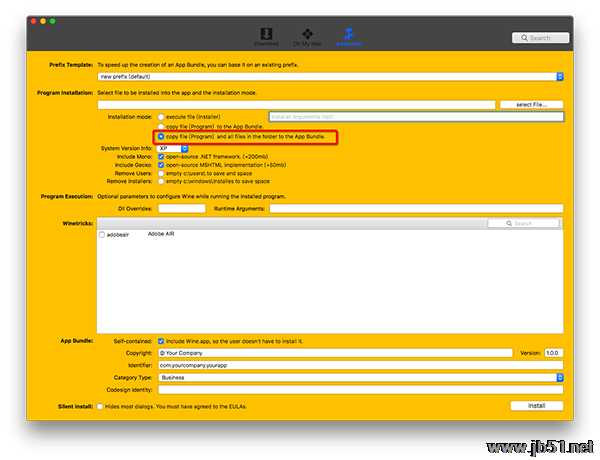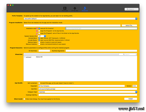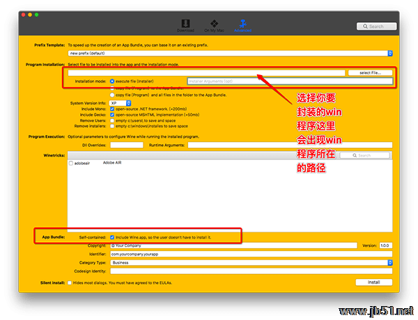 注意事項:對于我們一般用的win軟件有安裝版和綠色版之分,對于安裝版的軟件我們選擇a對應選項,對于綠色版選擇b和c選項。“App Bundle”這里如果勾選后面的“Include Wine....”就是說直接把你轉制的軟件拷貝到別的機器也可以用,而不用提前安裝Wine。