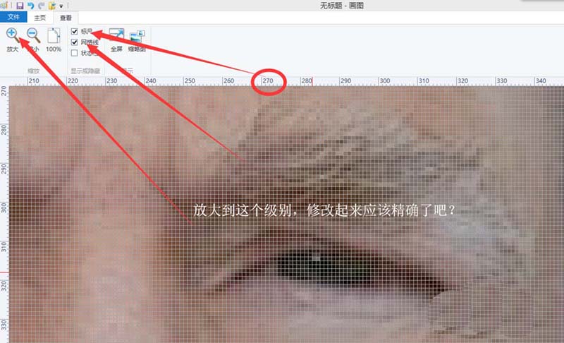 4、圖片放大了,可以用鉛筆選色修改了。為了精確,我們在圖片上添加網格線和標尺,它們在菜單欄的“查看”里。快捷鍵是ctrl+G和ctrl+R,添加了網格線和標尺后,修改是不是更有把握了?