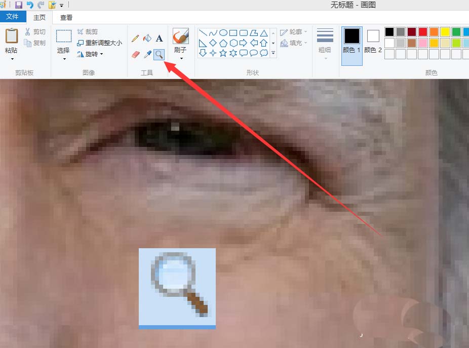 2、在畫圖工具的菜單里,找到“主頁”,一般打開畫圖,就是這個界面。認識一下放大鏡和鉛筆工具,精確修改離不開這兩個工具。