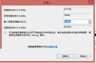 在打開的壓縮卷窗口中,在“輸入壓縮空間量”處輸入合適的數(shù)值(一般1G就夠了),如下圖所示: