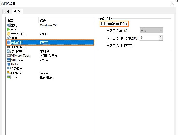 8、在虛擬機設(shè)置界面中,去掉“啟用自動保護”前面的勾選,確定即可。