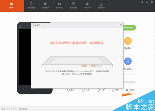 如果你的手機沒有進入fastboot模式接入的話,點擊刷機會顯示 如圖所示的提示,這個時候只需要 進入fastoot模式就可以了 (在關機或者MI界面:音量下+電源鍵長按5秒左右就可以進入了)