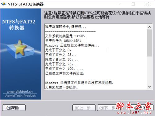 根據磁盤大小、已保存的文件容量將決定這個轉換過程的時長。完畢后,會有一個成功的提示。特別提醒,如果可能,請將被轉換的硬盤/閃存盤連接到筆記本上執行,如果突然斷電,磁盤很可能出錯,數據丟失。