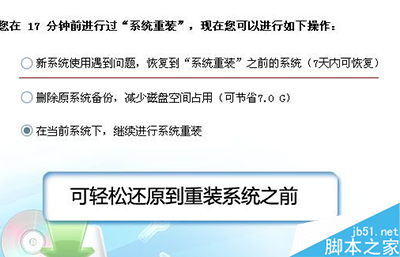 溫馨提示:除了上面提到的方法外,在電腦重啟的過程中,也會出現一個選擇界面,允許電腦還原到“金山裝機精靈”重裝系統之前的系統。