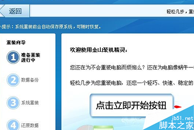 3、在繼續操作前,我告訴老爸需要先將電腦中的殺毒軟件關掉,也盡量不要再運行其它的程序了。“然后點擊右下角處的‘立即開始’按鈕,這時金山裝機精靈會詢問您是否需要備份數據。”