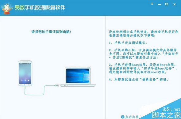 USB調試模式是 Android 提供的一個用于開發工作的功能,使用該功能可在計算機和 Android 設備之間復制數據。默認情況下,USB 調試模式是關閉的,所以需要手動打開它;易數手機數據恢復軟件必須在開啟USB調試模式的情況下才能正常使用。如果沒有開啟USB調試模式,軟件將顯示如 下界面: