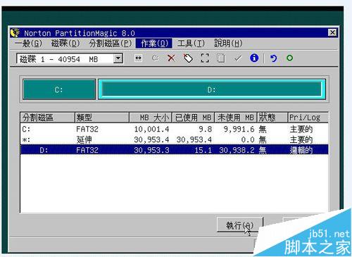 5、分配好的磁盤如下:一個主要分區為10g,一個邏輯分區為30g,盤符自動分配為C或者D盤。當前的磁盤并未格式化,接下來格式化分區。待一切操作就許,點擊“執行”執行之前所有的操作,或者綠色的小勾也可以。