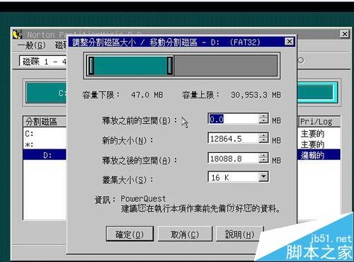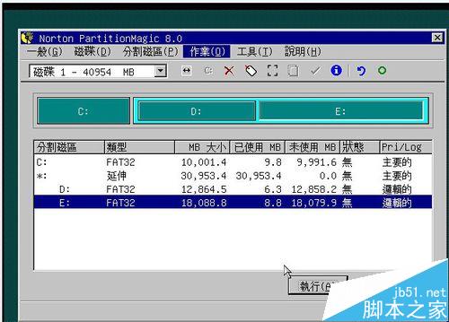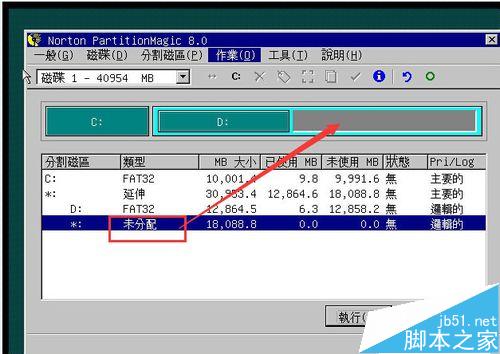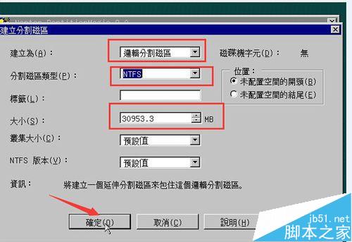 8、將未分配的18g從新建立邏輯分區:選擇未分配的磁盤:作業——〉建立——〉建立為選擇“邏輯磁區”格式選擇NTFS,點擊確定。新建立的磁區默認為E盤。