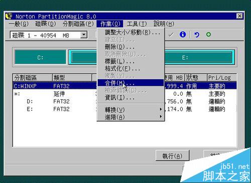 10、合并步驟為,選擇要合并的磁盤,點擊菜單欄——〉作業——〉合并。在彈出來的對話框中,選擇將某個盤符作為一個文件夾合并到另外一個盤中。點擊確定。