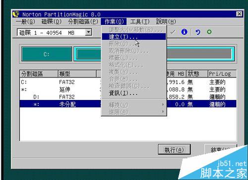 4、同樣,選中未建立的磁區,點擊菜單欄“作業”——〉建立。在彈出的對話框中,建立為”邏輯分割磁區“,格式為NTFS或者FAT32 ,大小默認為磁盤剩余容量,點擊確定以建立邏輯磁盤,用以存放普通文件。