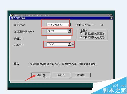 3、選中磁盤,點擊菜單欄“作業”——〉建立。在彈出的對話框中,建立為選擇”主要分割磁區“,格式為NTFS或者FAT32 ,容量大小為10G,點擊確定。建議選擇NTFS,其在安全性上具有很大的優勢。點擊確定以建立主分區,用來存放系統文件。