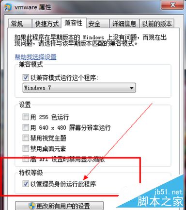 3、勾選在特權等級下的“以管理員身份運行 ,然后點擊確定,運行一下vmware,看看是否能夠正常運行,如果可以的話就不用做以下步驟;