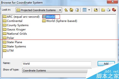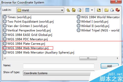 6、找到WGS 1984 Web Mercator.prj,點(diǎn)擊“Add”,如下圖所示: