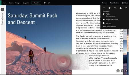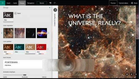 “認識表達思想的全新方式。 Sway是一款數字故事分享應用,適合公司、學校和家庭使用,使你能夠快速而輕松地創建和共享精美的交互式報表、演示文稿、個人故事等。 請添加你的內容,其他的交給我們。”