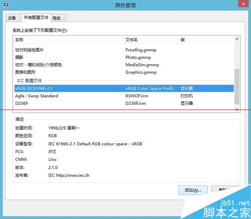 4、點擊所有配置文件,下拉找到ICC配置文件,選擇D2369.icm,刪除,再選擇Srgb這個文件,然后添加,確定即可