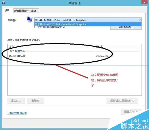 3、如下圖所示,選擇好顯示器,如果有幾個的話,可以看到下面的D2369.icm文件,就是他在搞鬼,替換成正常的就好了