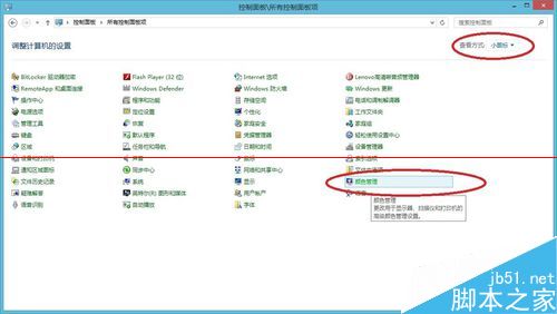 2、打開控制面板,找到顏色管理,用小圖標顯示,或者在右上角的搜索窗口中輸入顏色管理四個字也會自動彈出來,點擊進入