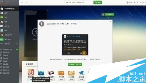 4:用數據線連接手機與電腦,電腦和手機上會提示是否允許USB調試,手機點擊確定。然后手機就會自動連接到豌豆莢。(如果手機提示是否安裝豌豆莢手機端,可以選擇安裝,也可以選擇不安裝)