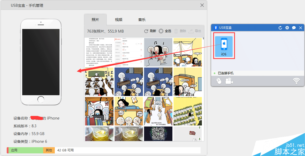 普通方法管理手機太繁瑣,那就來看看小編推薦的最簡單方法。如下圖,小編在電腦里下載安裝了USB寶盒。然而,手機第一次連接電腦時,iPhone6手機驅動是異常的,用這個軟件一鍵修復解決了(點擊IOS圖標,即可一鍵修復手機驅動)。從圖片中的手機管理界面看到,iPhone6里的圖片、視頻及音樂都一一分類好了,一目了然。
