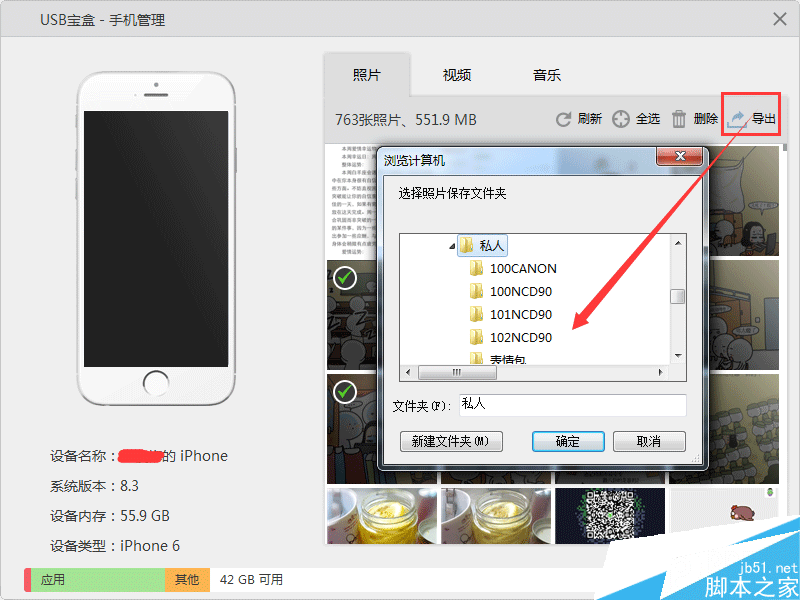 有了USB寶盒,除了一目了然的查看iPhone6里的圖片、視頻等,還可自行選擇或點擊全選按鈕進行全選,來刪除或導出手機里的文件(導入功能也即將上線),從手機管理界面左下方,可查看到手機的內存使用情況、系統版本等。