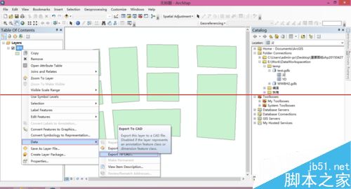 1、展開ArcCatalog連接的文件,選擇需要轉化的數據。單擊右鍵在彈出的右鍵菜單中選擇導出(Export)——導出到CAD(To CAD);