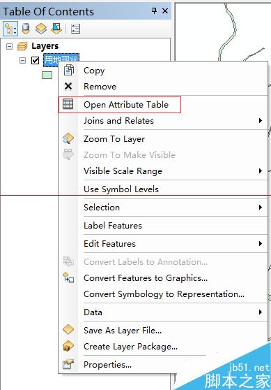 3、打開屬性表,在左側內容表中選擇要計算的數據,單擊右鍵,打開右鍵菜單,選擇打開屬性表(Open Attribute Table);