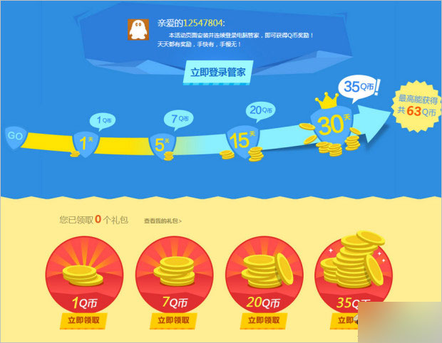 QQ電腦管家狂撒百萬Q幣活動,連續登錄電腦管家,即可獲得Q幣獎勵!首次登錄即可獲得1Q幣,連續登錄5天,可獲得7Q幣;連續登錄15天,可獲得20Q幣;連續登錄30天,可獲得35Q幣。Q幣每天限量發放,先到先得,領完即止!