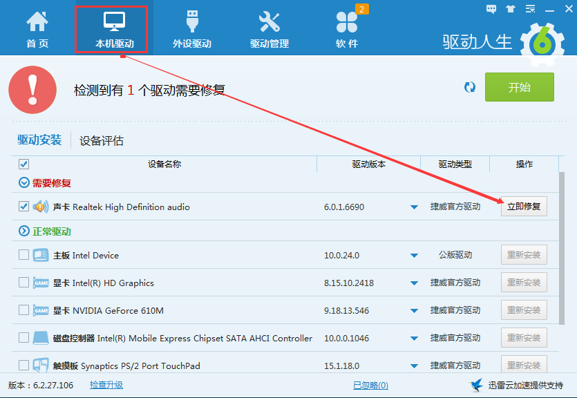 重啟完成后,打開驅動人生選擇本機驅動,然后點擊立即修復,驅動人生就會幫你重新修復好聲卡驅動,當你聲卡驅動正常了,就不愁好友聽不到你的QQ語音了。